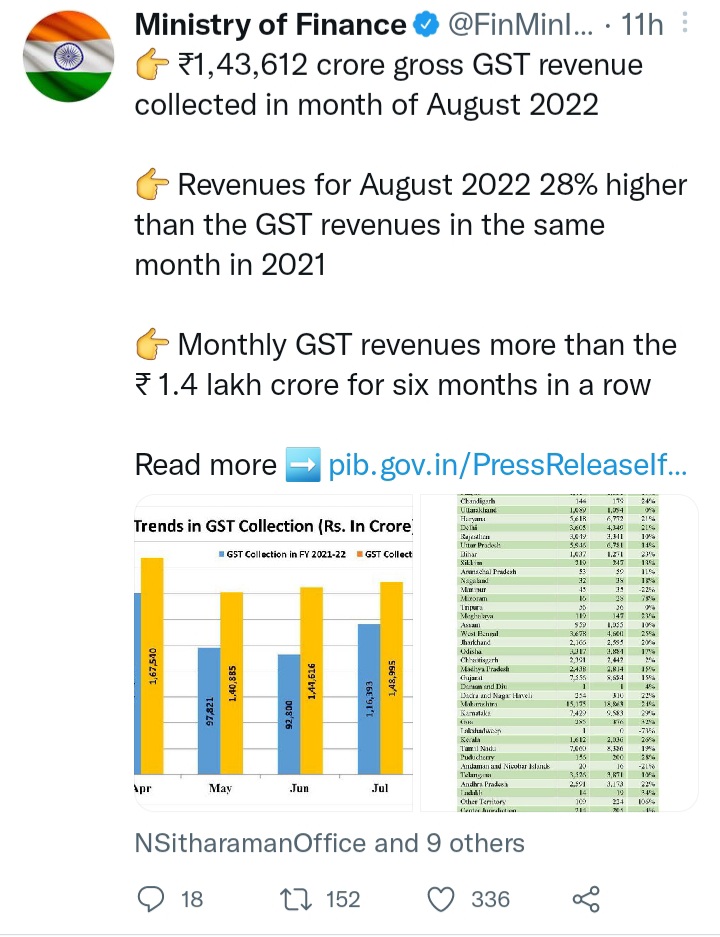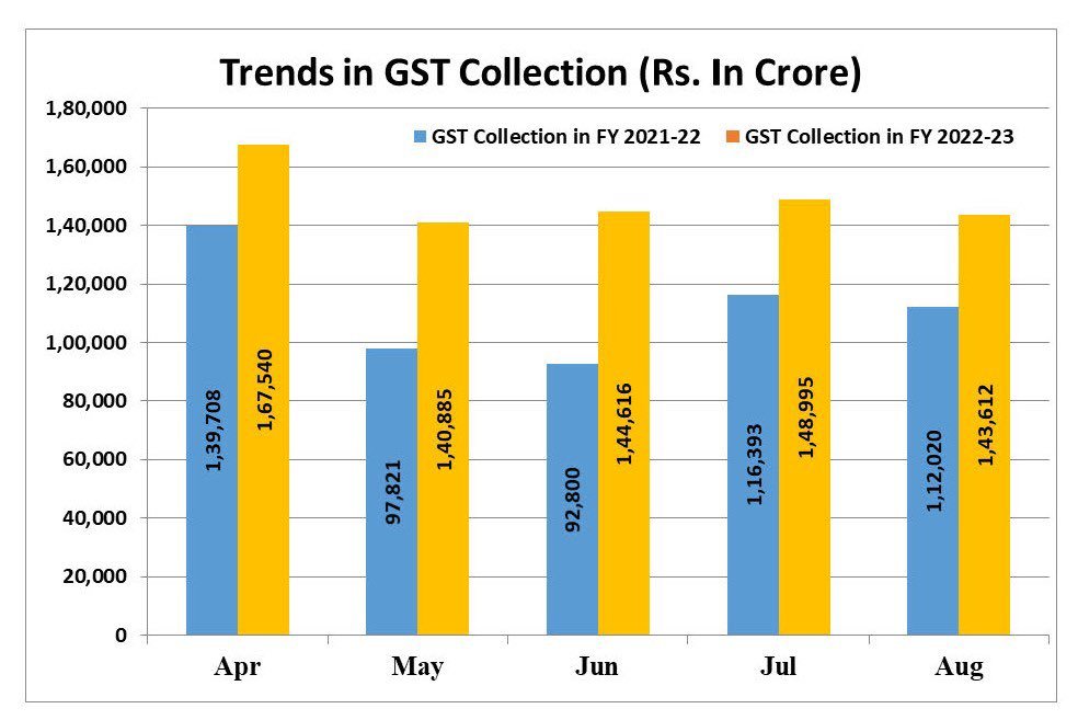 ఆగస్టు 2022 నెలలో ₹1,43,612 కోట్ల స్థూల GST ఆదాయం సేకరించబడింది