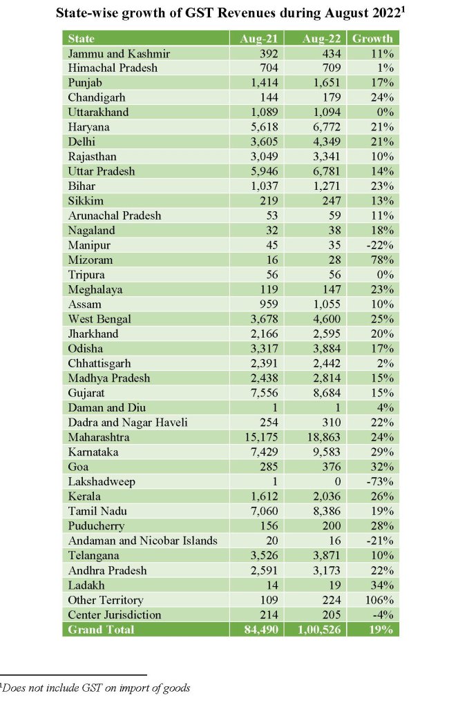 ఆగస్టు 2022 ఆదాయాలు 2021లో అదే నెలలో GST రాబడి కంటే 28% ఎక్కువ