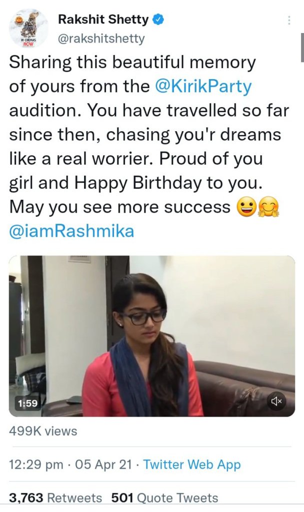2021 ఏప్రిల్ 5 న రక్షిత్ శెట్టి తన ట్విట్టర్ లో రష్మిక బర్త్డే సందర్భంగా రష్మీక కిర్రిక్ పార్టీ ఆడిషన్ వీడియో ను రిలీజ్ చేశారు ఆ వీడియో ను రాష్మికా కూడా ట్విట్టర్ లో రీట్వీట్ చేశారు ట్వీట్ ఇమేజెస్ లో చూడొచ్చు