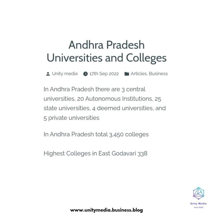 In Andhra Pradesh there are 3 central universities, 20 Autonomous Institutions, 25 state universities, 4 deemed universities, and 5 private universities In Andhra Pradesh total 3,450 colleges Highest Colleges in East Godavari 338 State universities : 1) Acharya Nagarjuna University Guntur 1976 General 2) Acharya N.G. Ranga University Guntur 1964 Agricultural 3) Adikavi Nannaya University … Continue reading Andhra Pradesh Universities and Colleges