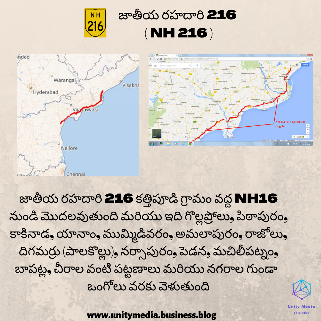 National Highway 216 ( NH216 )జాతీయ రహదారి 216 పొడవు : 391.289 కిమీ (243.136 మైళ్ళు) ప్రాథమిక గమ్యస్థానాలు : కాకినాడ, యానాం, అమలాపురం, రాజోలు, పాలకొల్లు, నరసాపురం, మచిలీపట్నం, బాపట్ల, చీరాల ఈ రహదారి మొత్తం మార్గం పొడవు 391.289 కిలోమీటర్లు (243.136 మైళ్ళు). ఇది ఆంధ్ర ప్రదేశ్ లోని తూర్పు గోదావరి, పశ్చిమ గోదావరి, కృష్ణా, గుంటూరు మరియు ప్రకాశం జిల్లాల గుండా వెళుతుంది. జాతీయ రహదారి 216 కత్తిపూడి గ్రామం … Continue reading జాతీయ రహదారి 216 ( NH 216 )