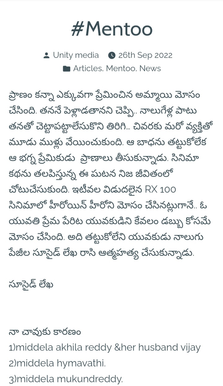 ప్రాణం కన్నా ఎక్కువగా ప్రేమించిన అమ్మాయి మోసం చేసింది. తననే పెళ్లాడతానని చెప్పి.. నాలుగేళ్ల పాటు తనతో చెట్టాపట్టాలేసుకొని తిరిగి… చివరకు మరో వ్యక్తితో మూడు ముళ్లు వేయించుకుంది. ఆ బాధను తట్టుకోలేక ఆ భగ్న ప్రేమికుడు ప్రాణాలు తీసుకున్నాడు. సినిమా కథను తలపిస్తున్న ఈ ఘటన నిజ జీవితంలో చోటుచేసుకుంది. ఇటీవల విడుదలైన RX 100 సినిమాలో హీరోయిన్ హీరోని మోసం చేసినట్లుగానే.. ఓ యువతి ప్రేమ పేరిట యువకుడిని కేవలం డబ్బు కోసమే మోసం … Continue reading #Mentoo