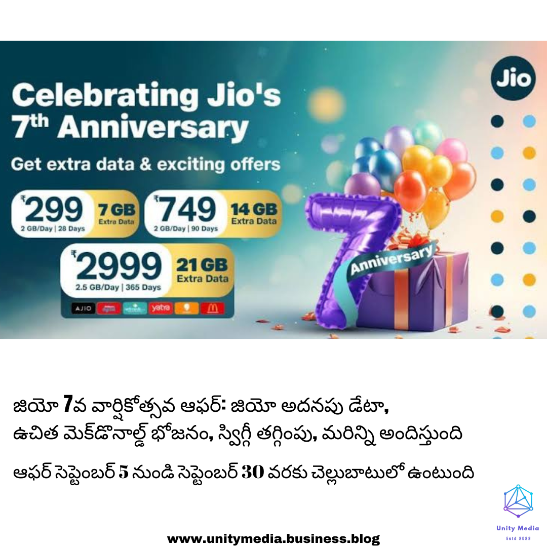 Jio 7వ వార్షికోత్సవ ఆఫర్ సెప్టెంబర్ 5 నుండి సెప్టెంబర్ 30 వరకు చెల్లుబాటులో ఉంటుంది