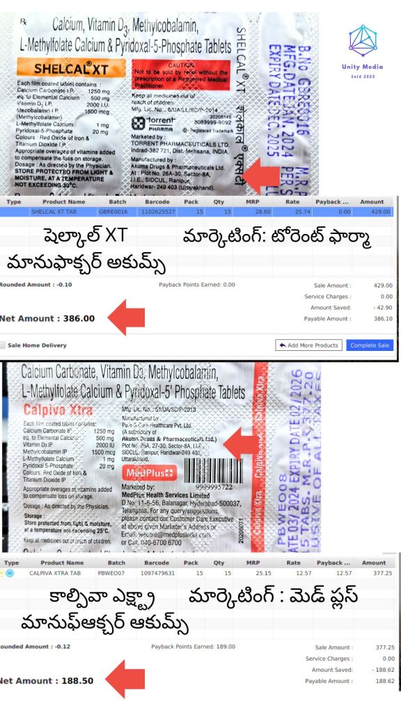 కానీ 3800+ లకు పైగా స్టోర్స్ వుండే మెడ్ ప్లస్ ఫార్మసీ కొత్తగా తమ బ్రాండ్ మెడిసిన్స్ ను లాంచ్ చేశారు అయితే మెడ్ ప్లస్ మాన్యుఫాక్చరింగ్ చేసేది చిన్న కంపెనీ లలో కాదు పెద్ద పెద్ద ఫార్మసీ కంపెనీలు ఎక్కడ అయితే మానుఫాక్చరెయింగ్ చేస్తిస్తారో అక్కడే మెడ్ ప్లస్ బ్రాండ్ మెడిసిన్స్ కూడా తయారు చేస్తారు ! ఉదాహరణ కు Shecal XT (Torrent Pharma) Price 429 rupees , Calpiva Xtra (MedPlus) Price 188 rupees ఈ రెండు కంపెనీ లు ఓకే తరరీ సంస్థ లో తయారు చేయిస్తారు ! మాన్యుఫాక్చరంగ్ సంస్థ పేరు అకుమ్స్ డ్రగ్స్ అండ్ ఫర్మసిటికల్స్, కానీ Torrent Pharma Shecal అనే బ్రాండ్ నీ ఆడ్స్ లోనూ మరియు మార్కెటింగ్ ఖర్చు కలిపి ధర నిర్ణయిస్తారు !